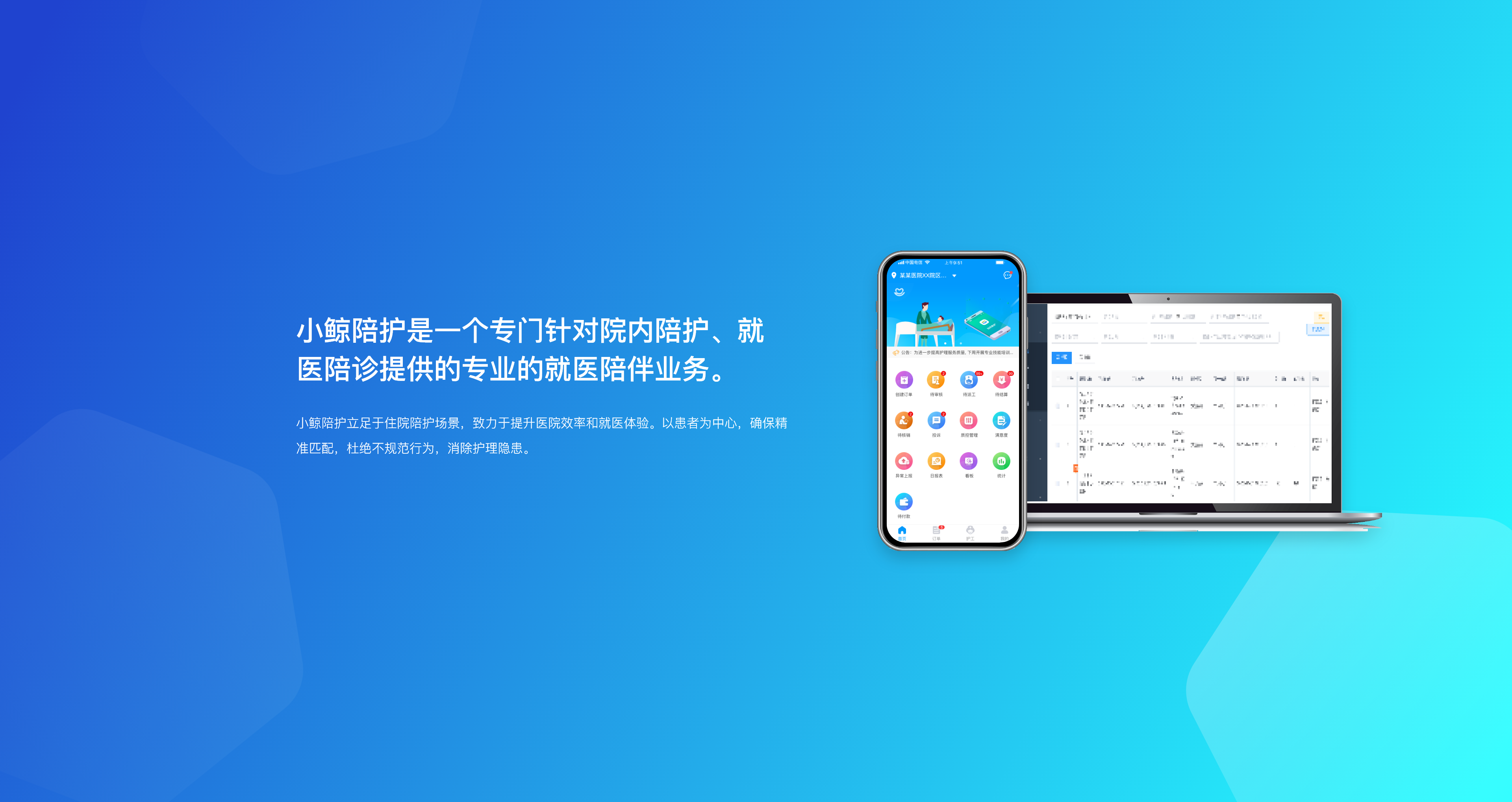 小鲸陪护立足于住院陪护场景,致力于提升医院效率和就医体验。陪护平台通过服务协议电子化,服务流程信息化,并打通了线上支付、退款、续费、财务统计、结算、数据报表等,使得对账更高效管理更便捷,流程可追溯。在提高服务质量的同时又有利于降低风险/提升管控/提升效率/降低成本/提升品牌等特点。